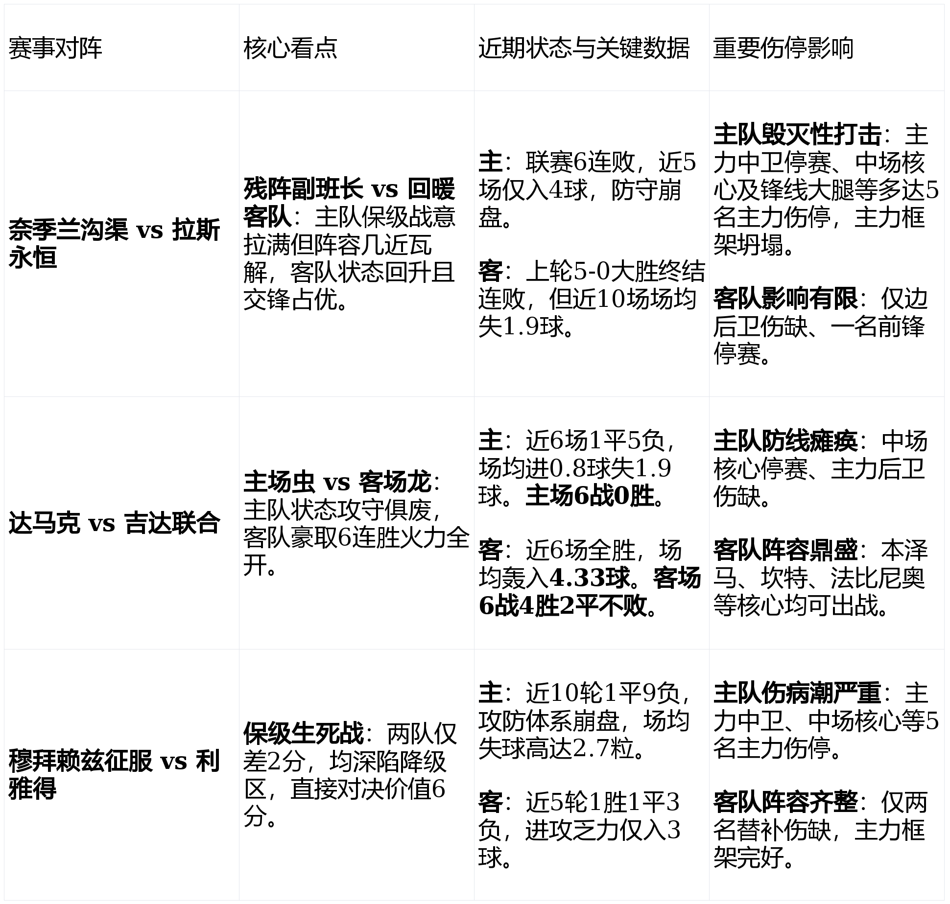 的一场。达马克不仅状态跌入谷底(近6场1平5负),主场更是毫无战力(6战0胜),且防线因伤停近乎瘫痪。反观吉达联合,正处在本赛季最佳时期,6连胜期间场均4.33球的火力堪称恐怖,由本泽马领衔的锋线和坎特+法比尼奥构筑的中场,无论在技术还是对抗上都形成碾压。