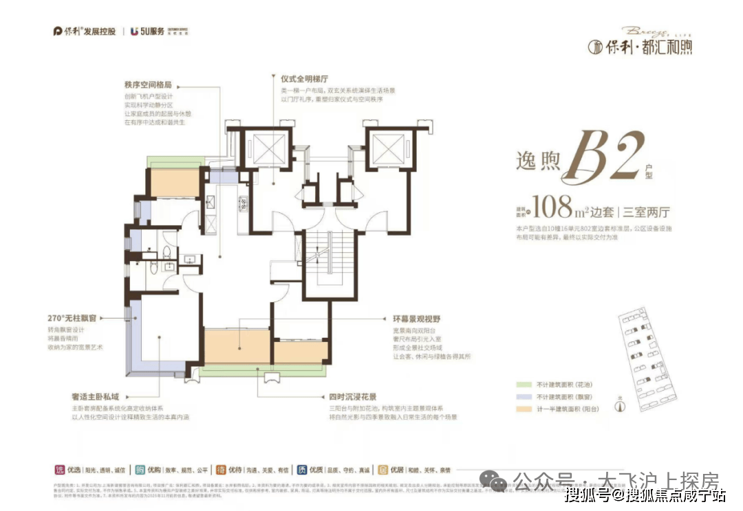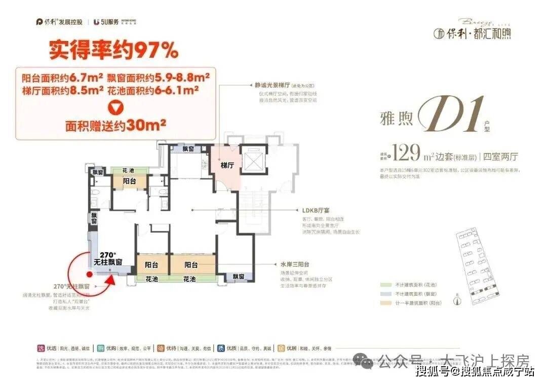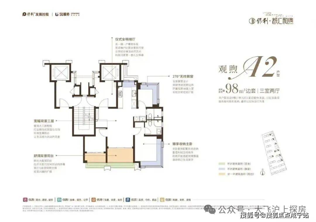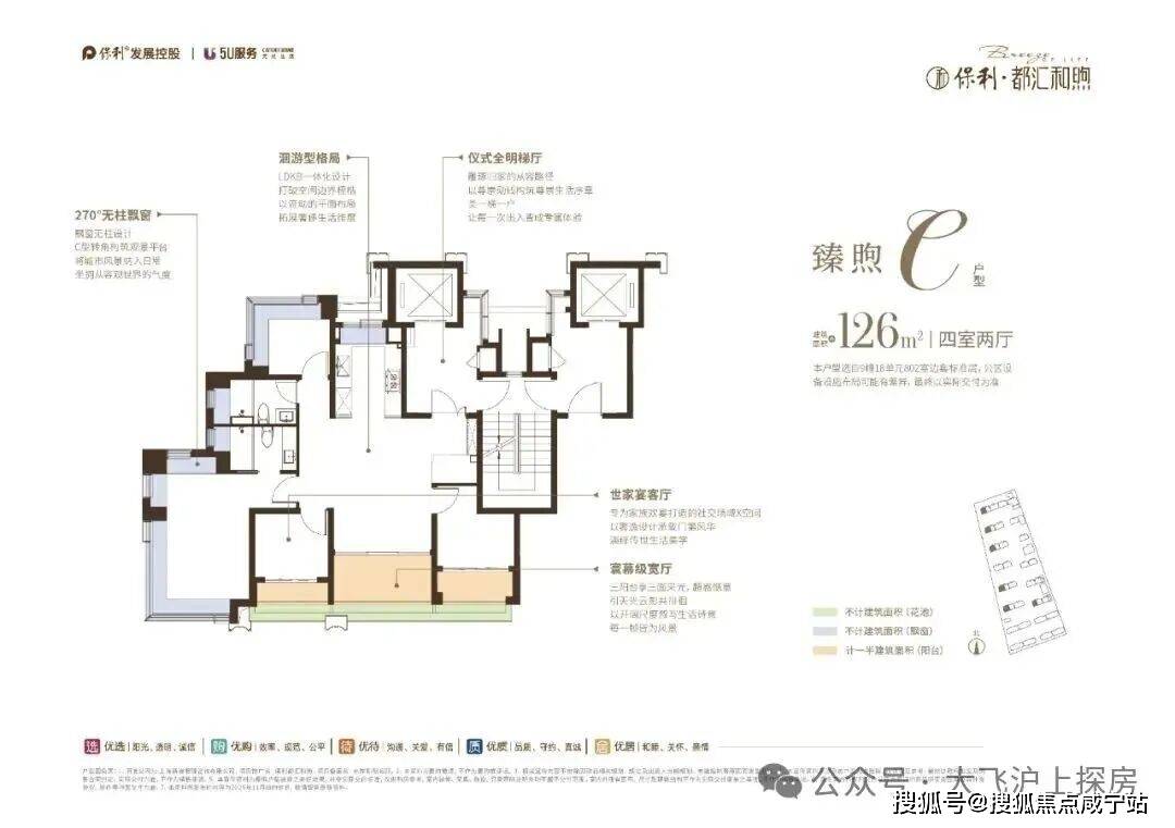98㎡边套双270°无柱飘窗、108㎡边套主卧270°无柱飘窗、126㎡边套双270°无柱飘窗,项目打造了闵行首个全景舱户型