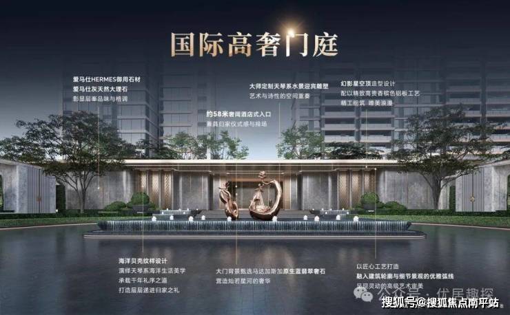 巨制约58米奢阔酒店式门庭,以层层递进之礼,尊崇迎归。定制天琴系水景迎宾雕塑,幻影星空顶,爱马仕HERMES御用石材,爱马仕灰天然大理石饰面配以香槟色铝板工艺,大门背景甄选马达加斯加原生蓝翡翠奢石,尽显奢雅品味与归家排场。