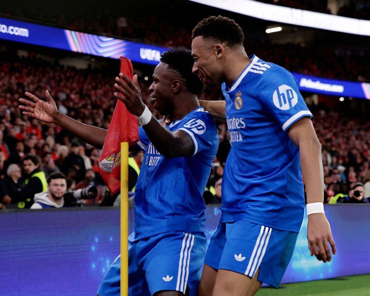在葡萄牙里斯本的光明球场,皇家马德里与本菲卡的比赛则充满了火药味和争议。双方在上半场互有攻守但均无建树,皇马头号球星姆巴佩还浪费了一次绝佳的单刀机会。比赛的僵局直到第52分钟才被打破。姆巴佩在左路分球,维尼修斯得球后内切,晃开防守球员,在禁区前沿用右脚轰出一记美妙的弧线球,皮球直挂球门远角,世界波!皇马1-0领先。